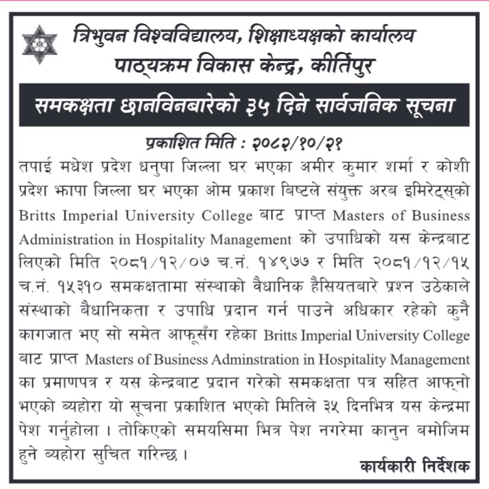 समकक्षता छानविनबारेको ३५ दिने सार्वजनिक सूचना । मिति २०८२।१०।२१