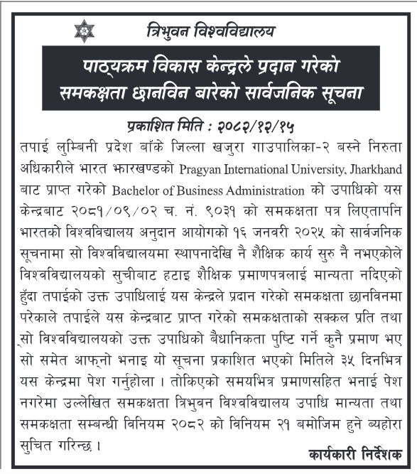 त्रिभुवन विश्वविद्यालय पाठ्यक्रम विकास केन्द्रले प्रदान गरेको समकक्षता छानविन बारेको सार्वजनिक सूचना ।